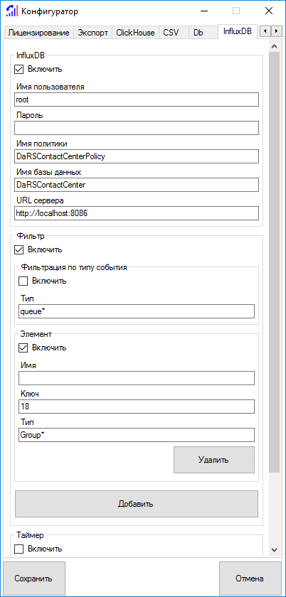 Вкладка InfluxDB отвечает за работу адаптера InfluxDB, настройку фильтрации для адаптера InfluxDB, настройку таймера переподключения.